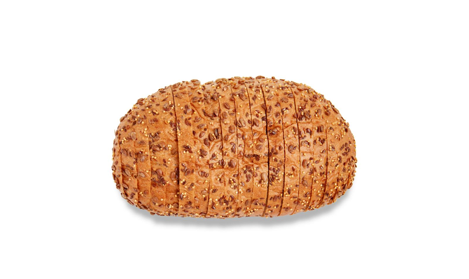 Con masa madre de harina y arroz y almidones de tapioca y maiz y harinas de trigo sarraceno y lino. Recubierta con un 7% de semillas de lino, girasol y mijo.