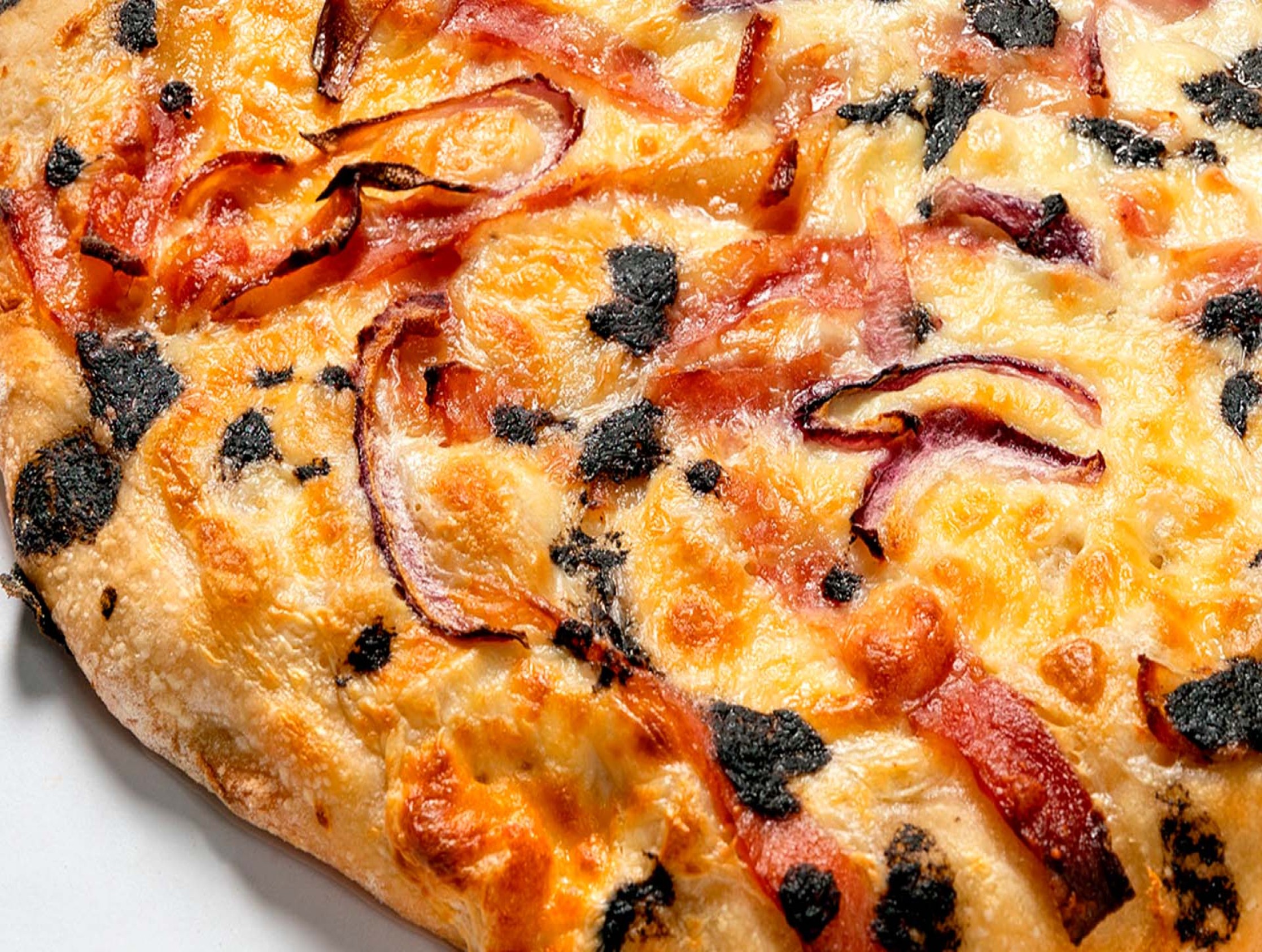 Queso mozzarella 100% y bechamel de base, cebolla morada, queso crema, bacon y deliciosa salsa de trufa que le aporta un sabor único.