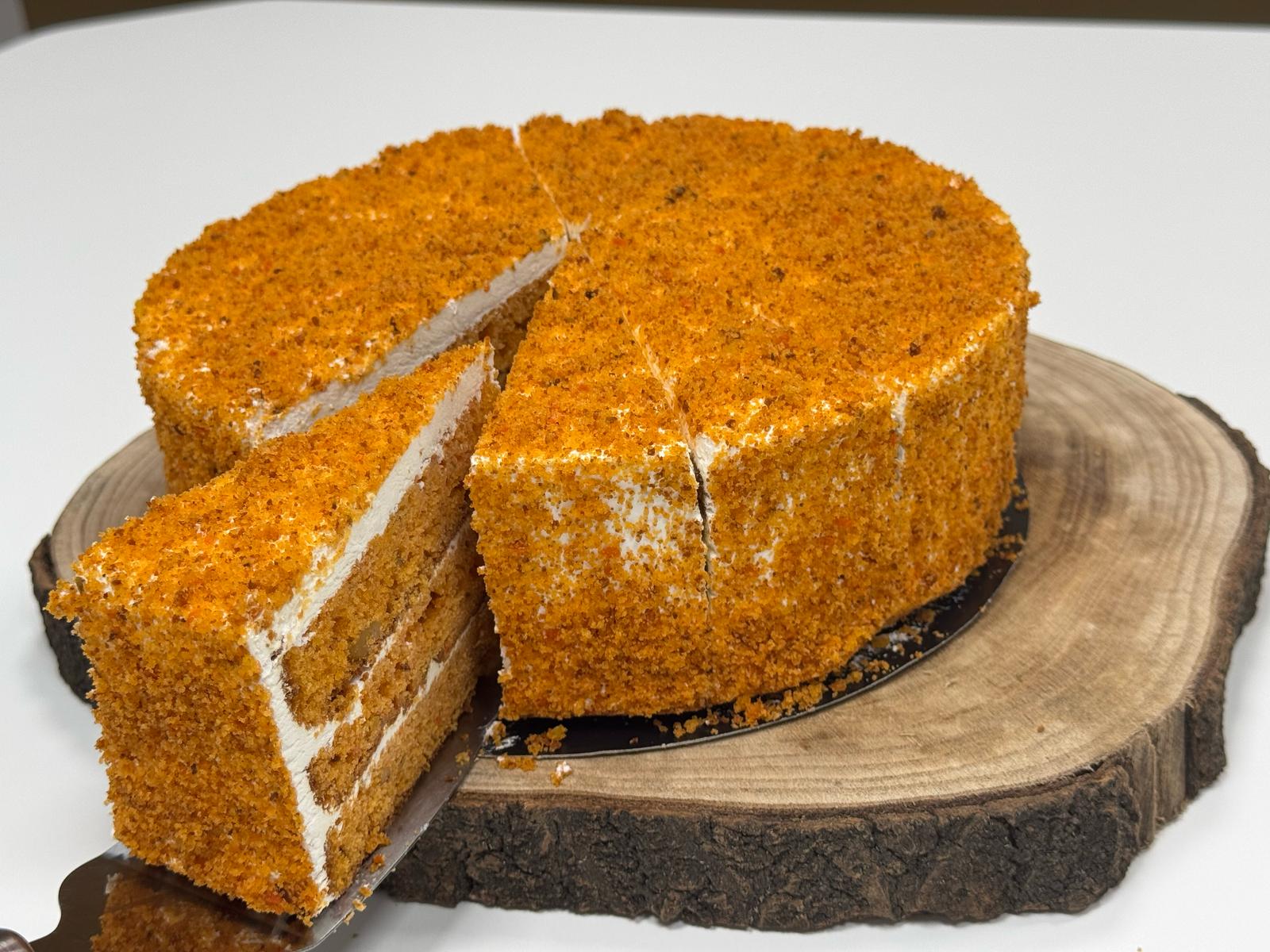 Deliciosa masa de zanahoria y nueces, relleno y cobertura de crema batida con sabor a vainilla.